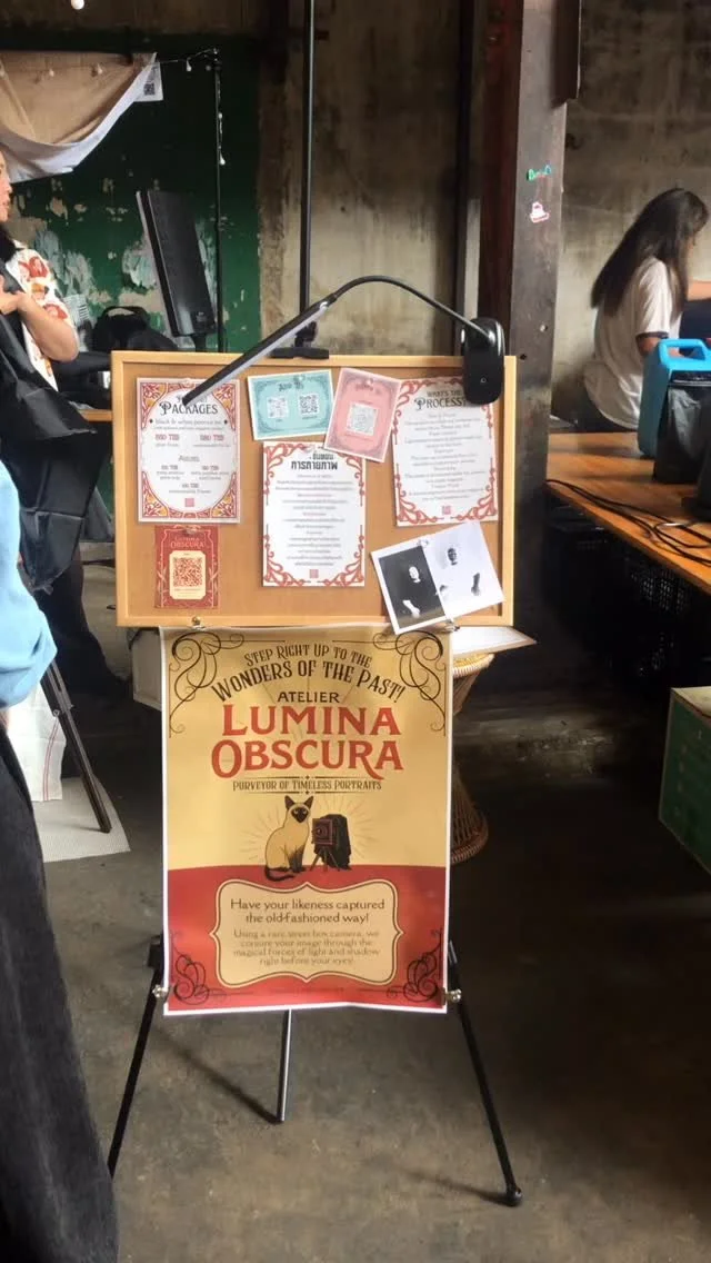 We offer traditional analog portrait experiences using a century old photography technique. In each session, you will get one negative print and one positive print of your portrait, a paper frame, and an option to customize the frame with wax seals, stickers, and name tags. We are currently planning to bring our camera and set up pop-up portrait booths at fairs and events around Bangkok.